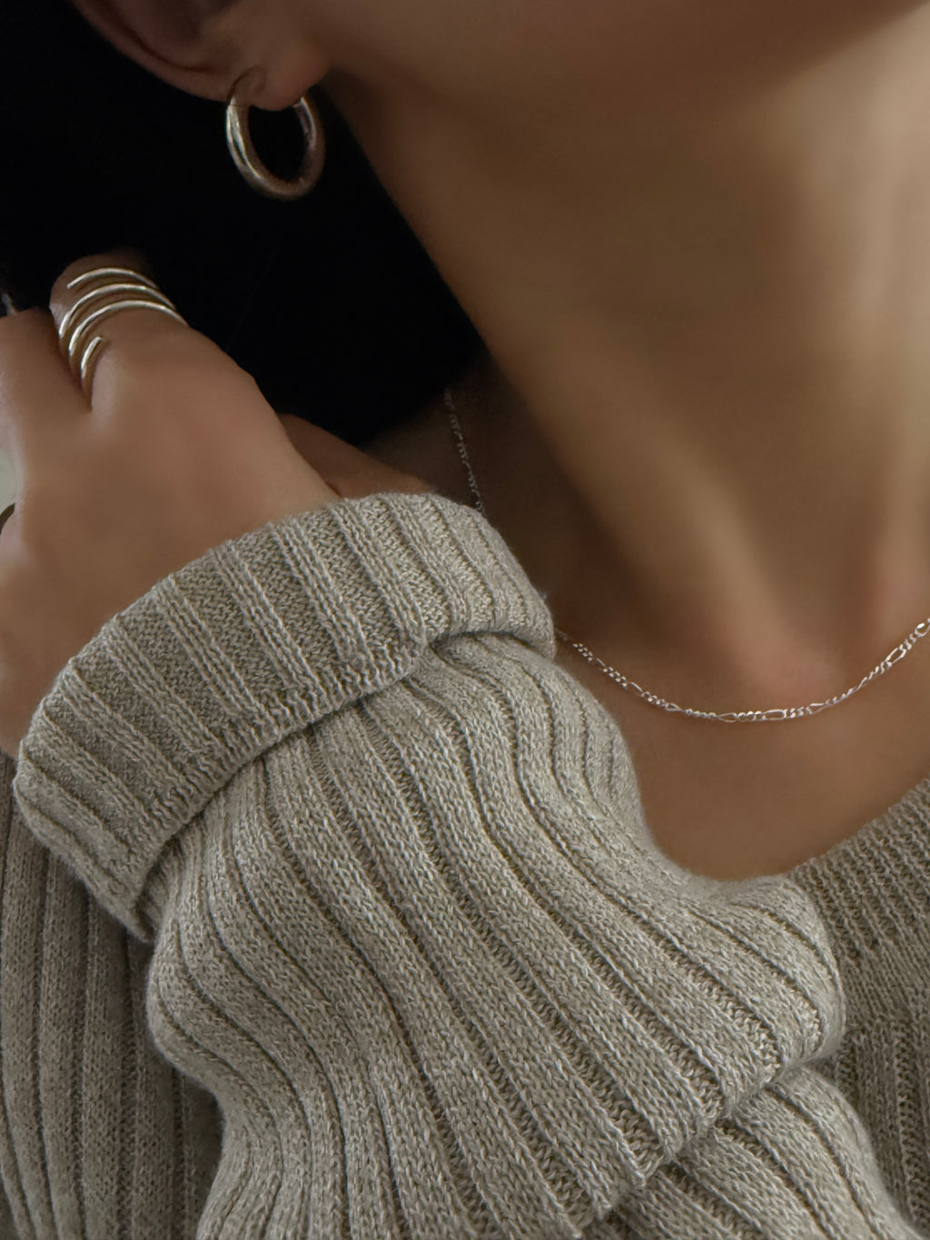 華奢な幅感でありながら、光を受けるたびに程よくきらめき、首元に上品なアクセントをプラス。