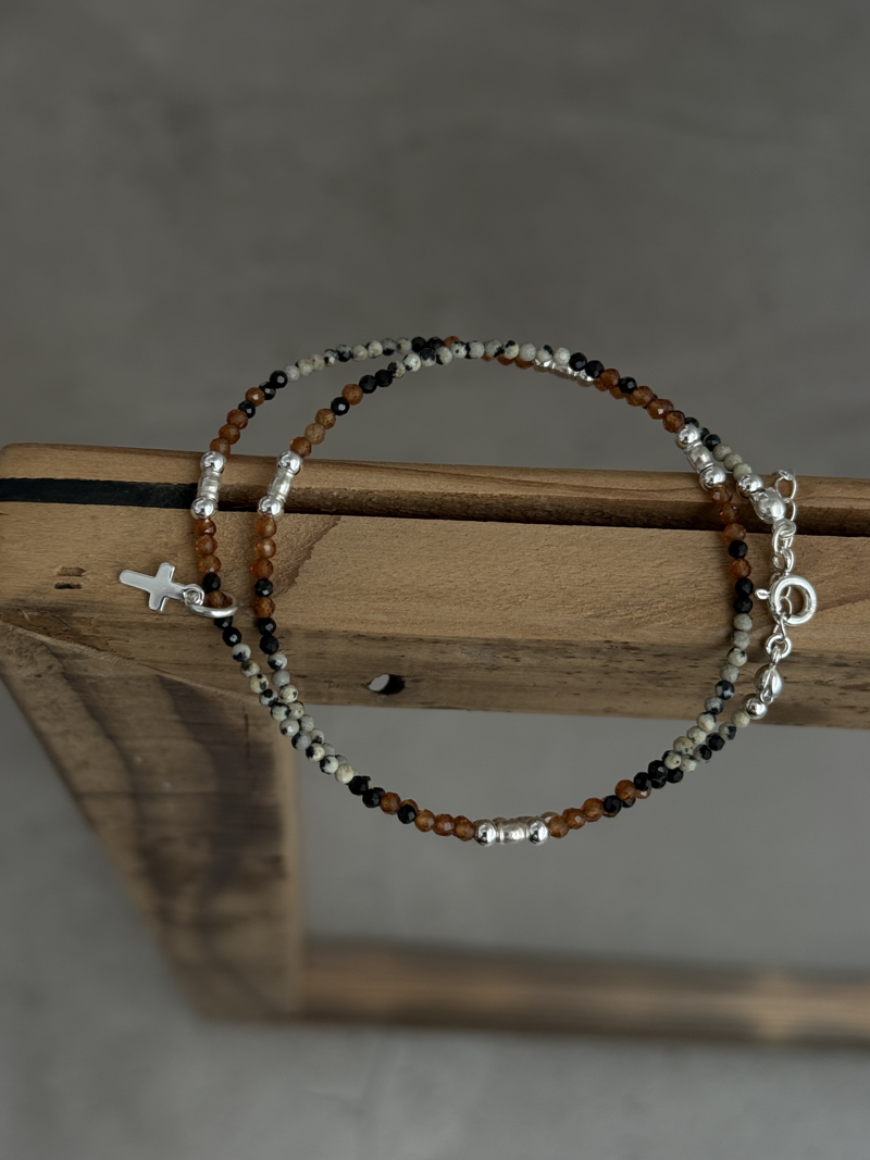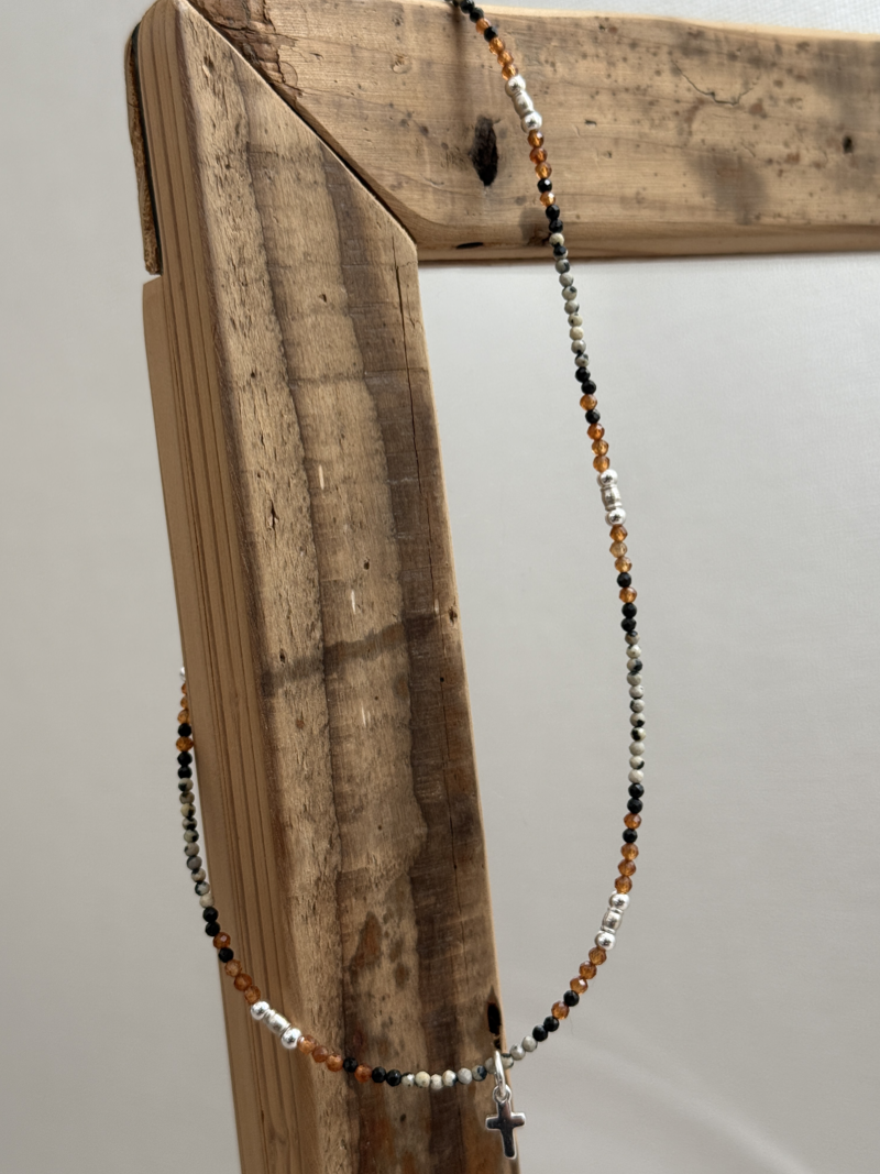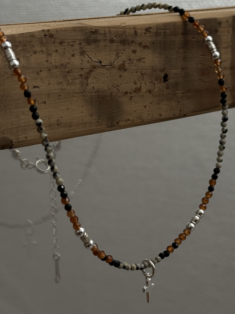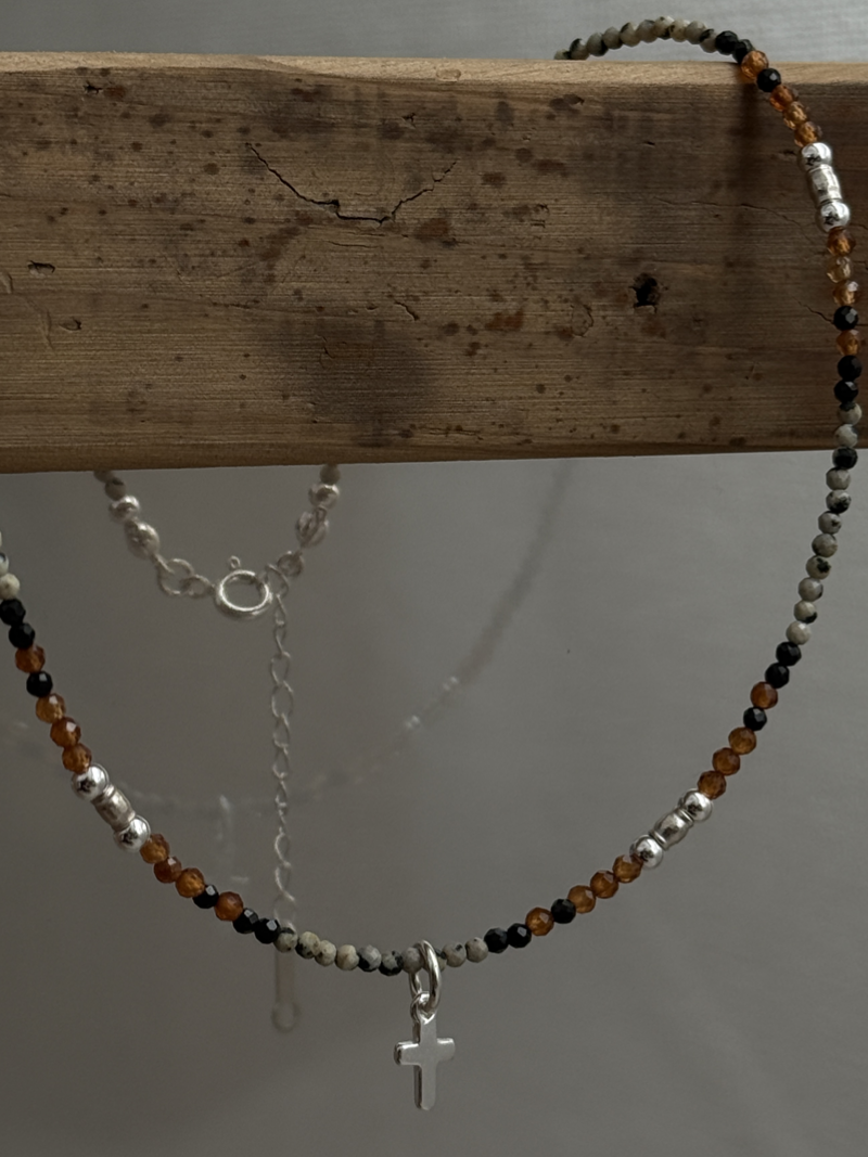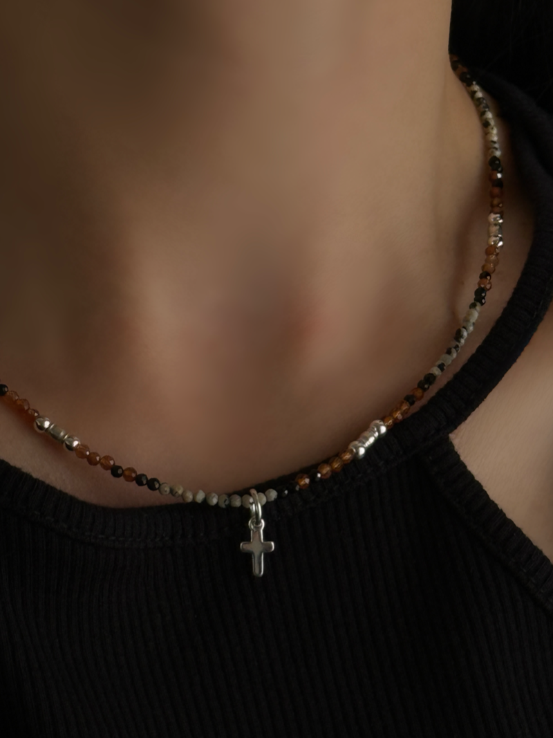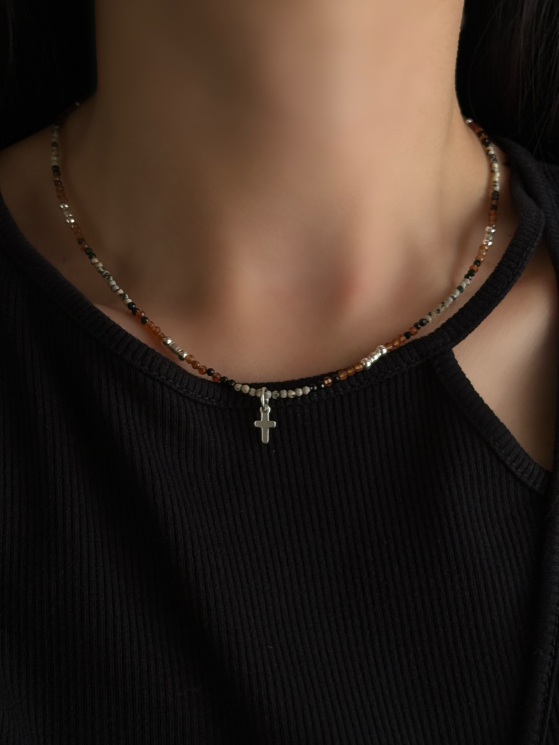 Silver925 ×1月誕生石 ヘソナイト クロスミニチャーム チョーカーネックレス(ハンドメイド)