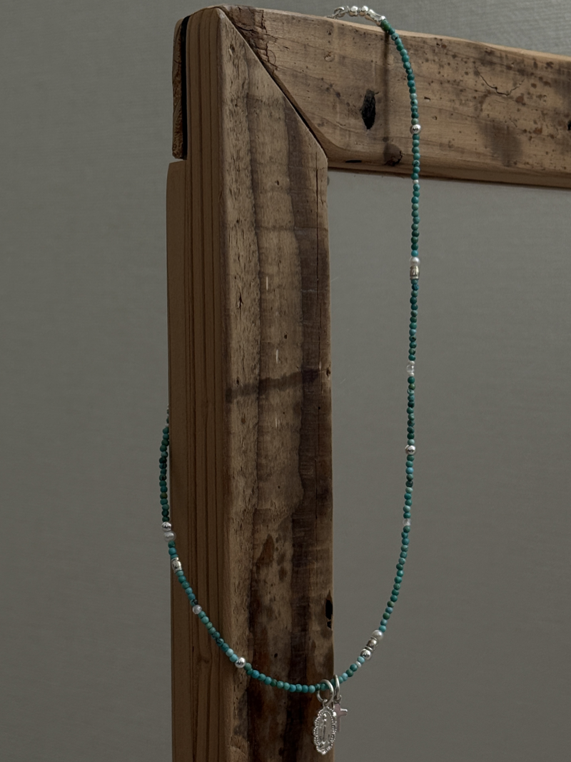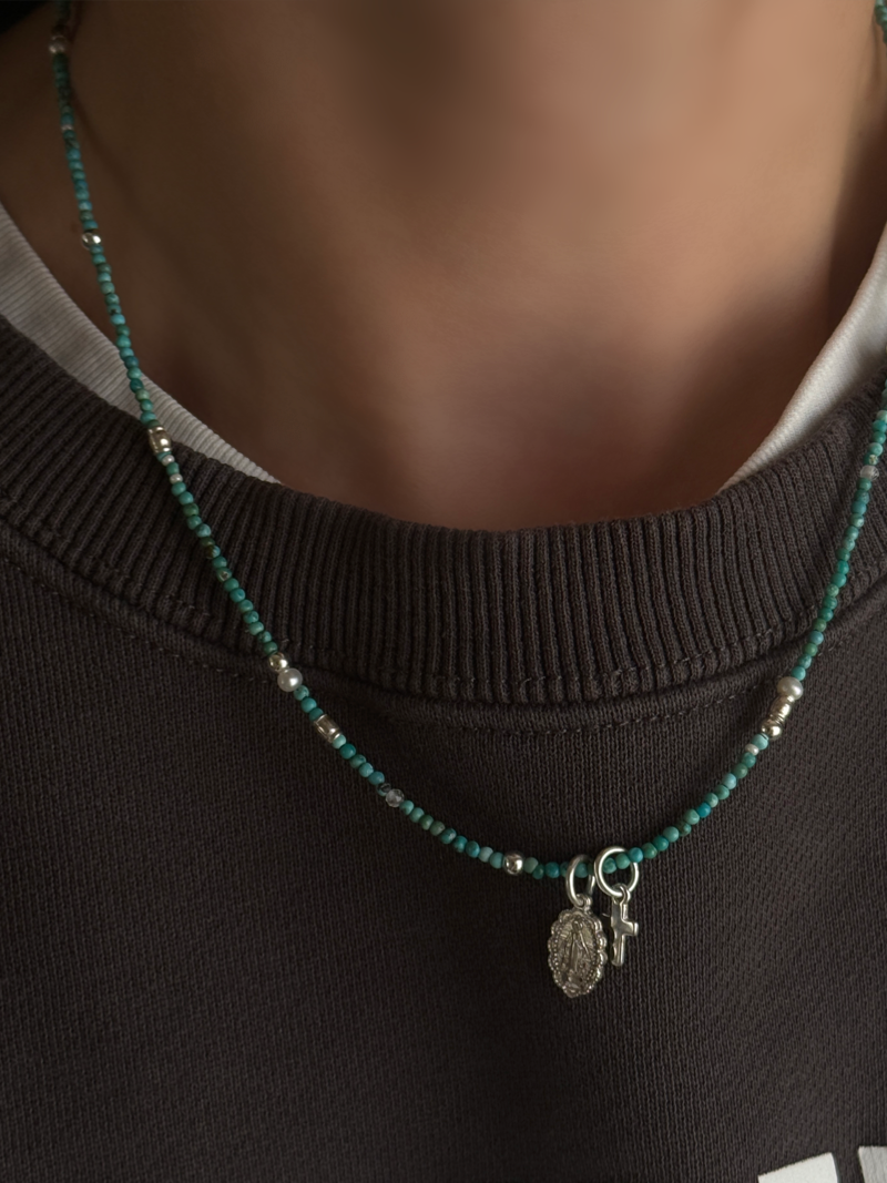 ミニチャームネックレスとして仕立てられたターコイズは、さりげなく胸元に彩りを添え、日常のコーディネートに明るいアクセントを加えてくれます。シンプルなデザインだからこそターコイズの澄んだブルーが引き立ち、普段使いにも特別な日にも活躍します。
