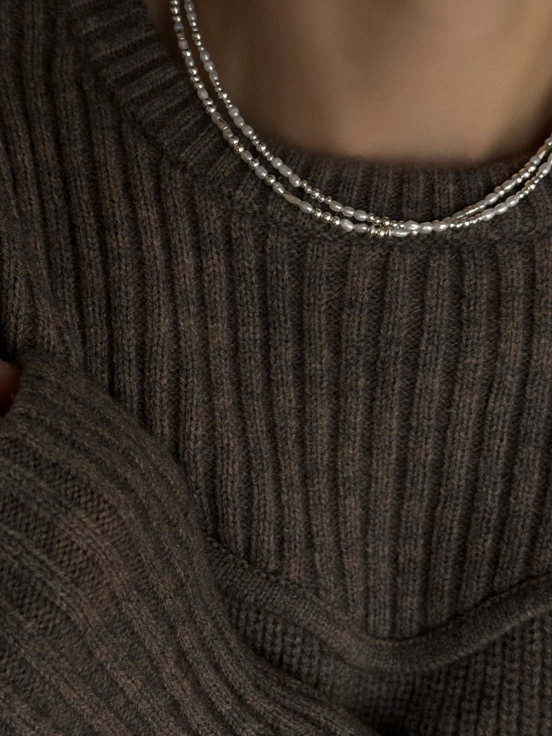小さなバロックパールとシルバービーズをランダムにに並べた、女性らしさとかっこよさを両方兼ね備えたチョーカーネックレス。