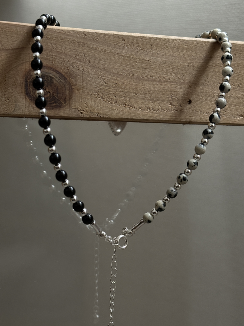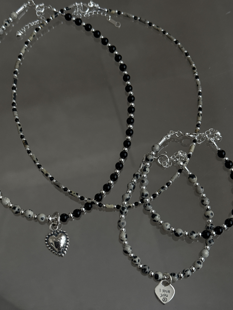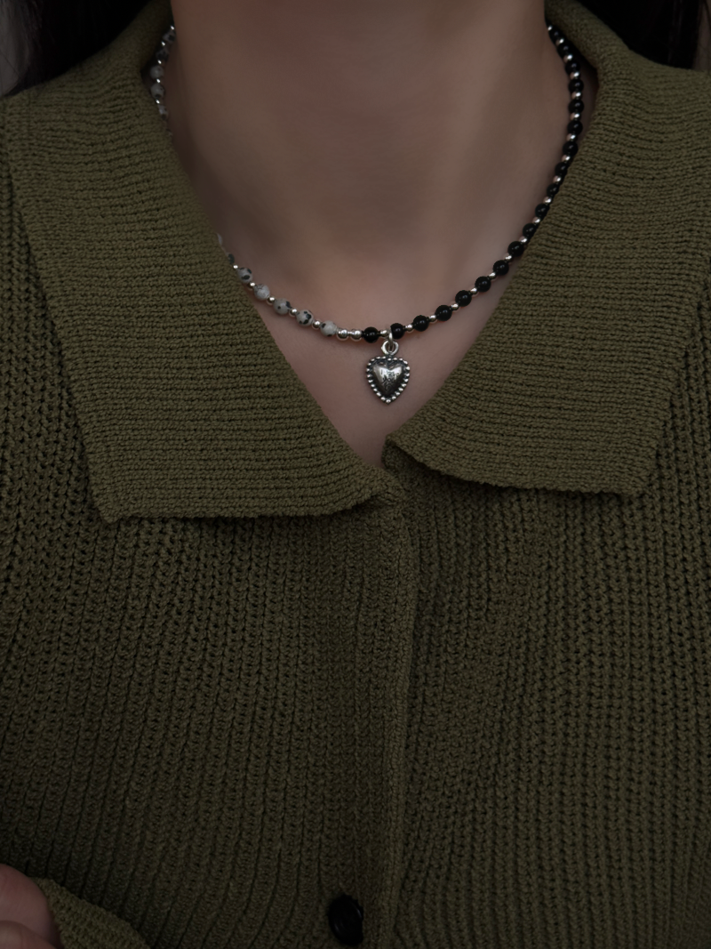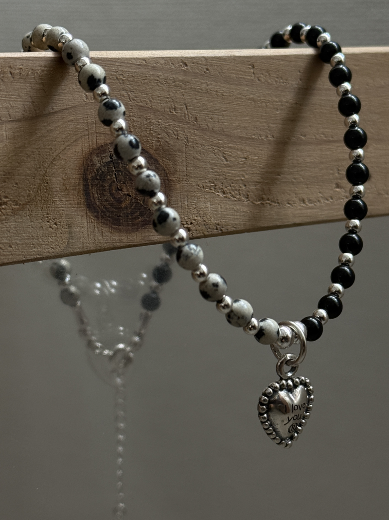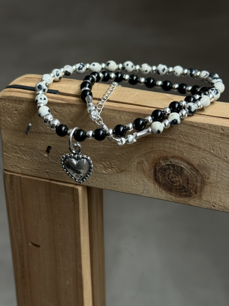 Silver925×天然石|ダルメシアンジャスパー+オニキス ハートトップチョーカーネックレス 36cm〜39cm(Reeplushハンドメイド)