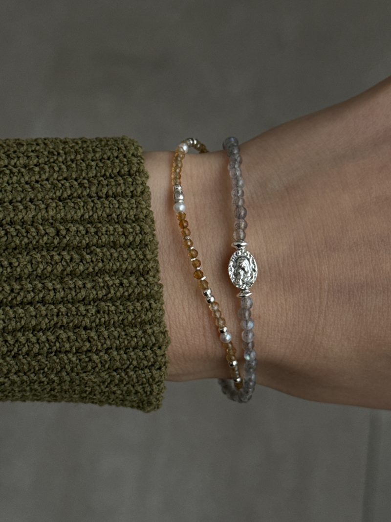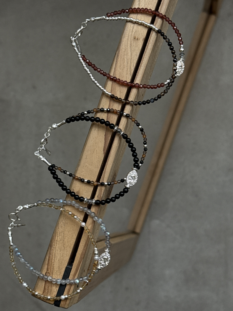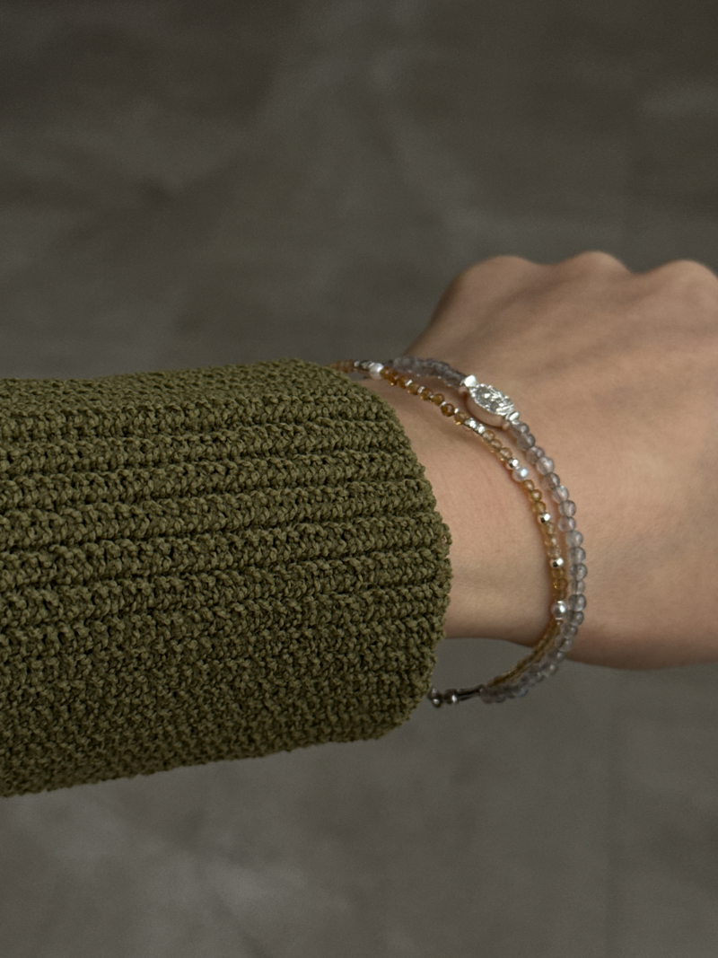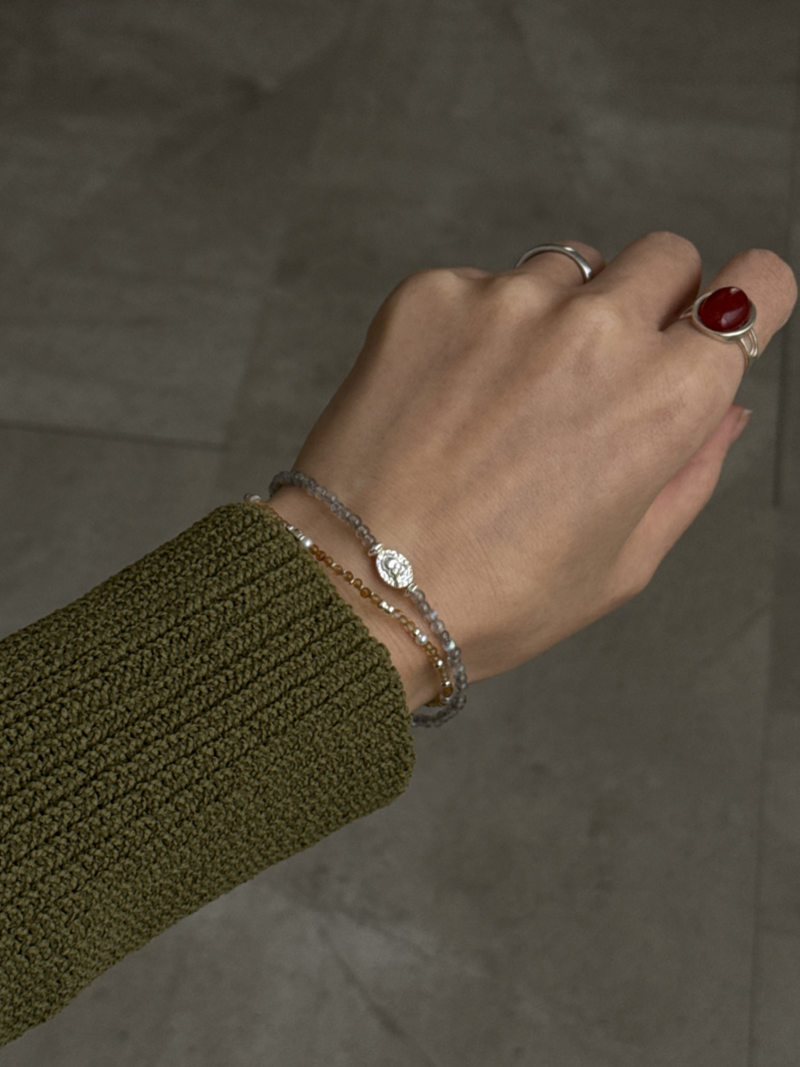 天然石のやさしい輝きと、シルバーの上品なツヤが手元に自然な存在感を与える華奢なラインの2連ブレスレットです。