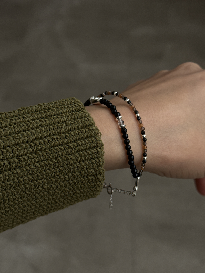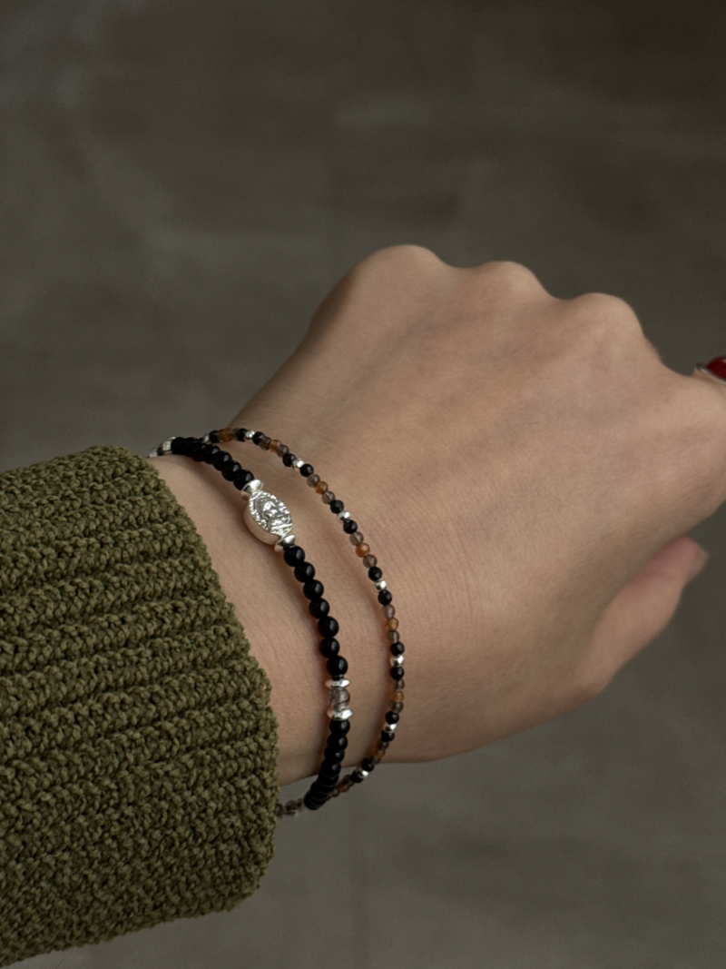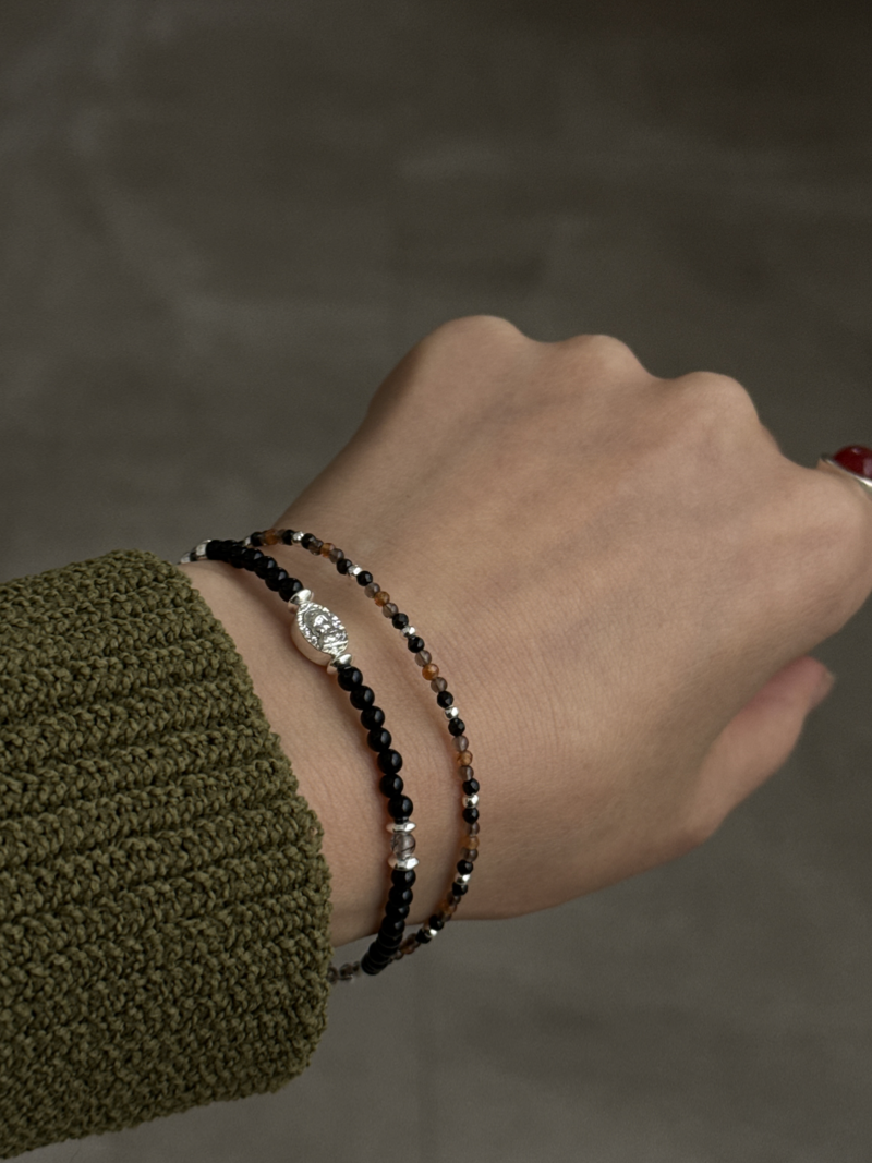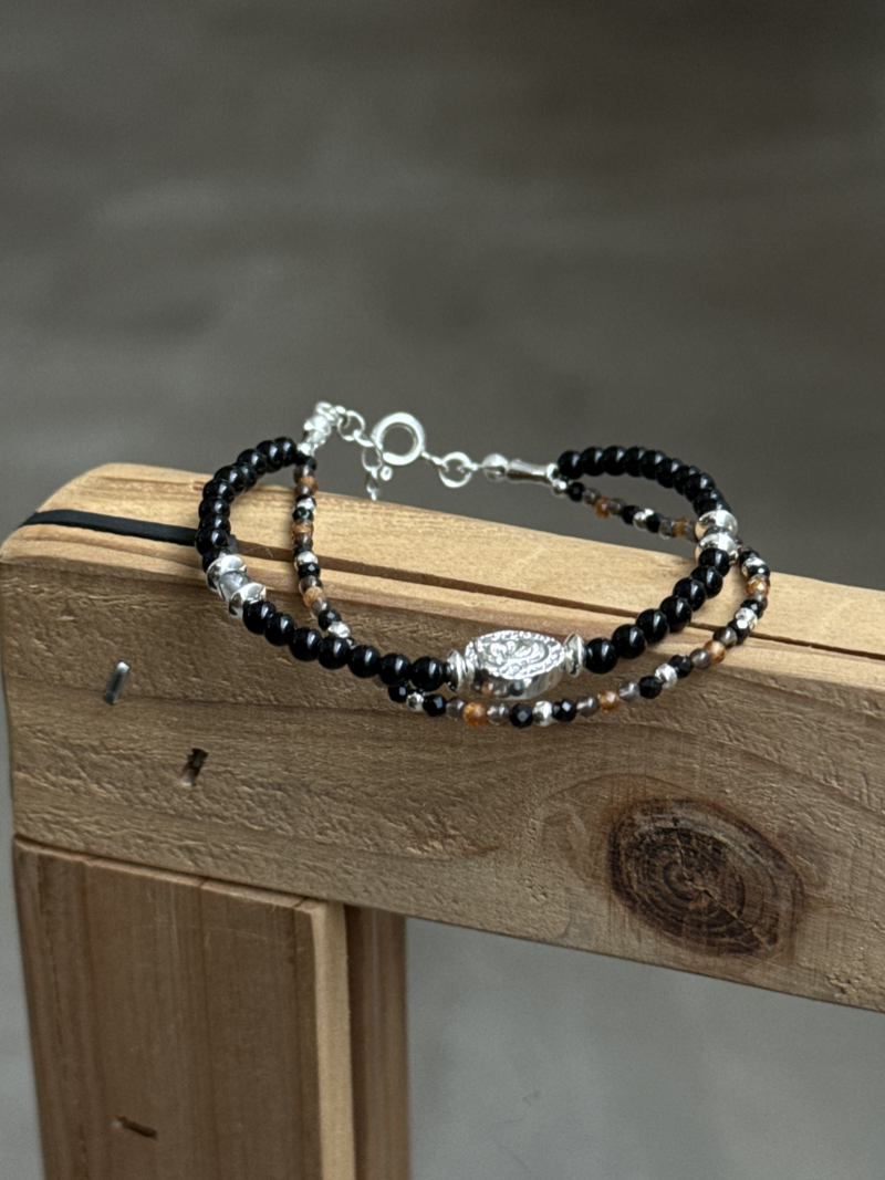 オニキス、スモーキークォーツ×オニキス×ヘソナイトを組み合わせた、2連ブレスレットです。