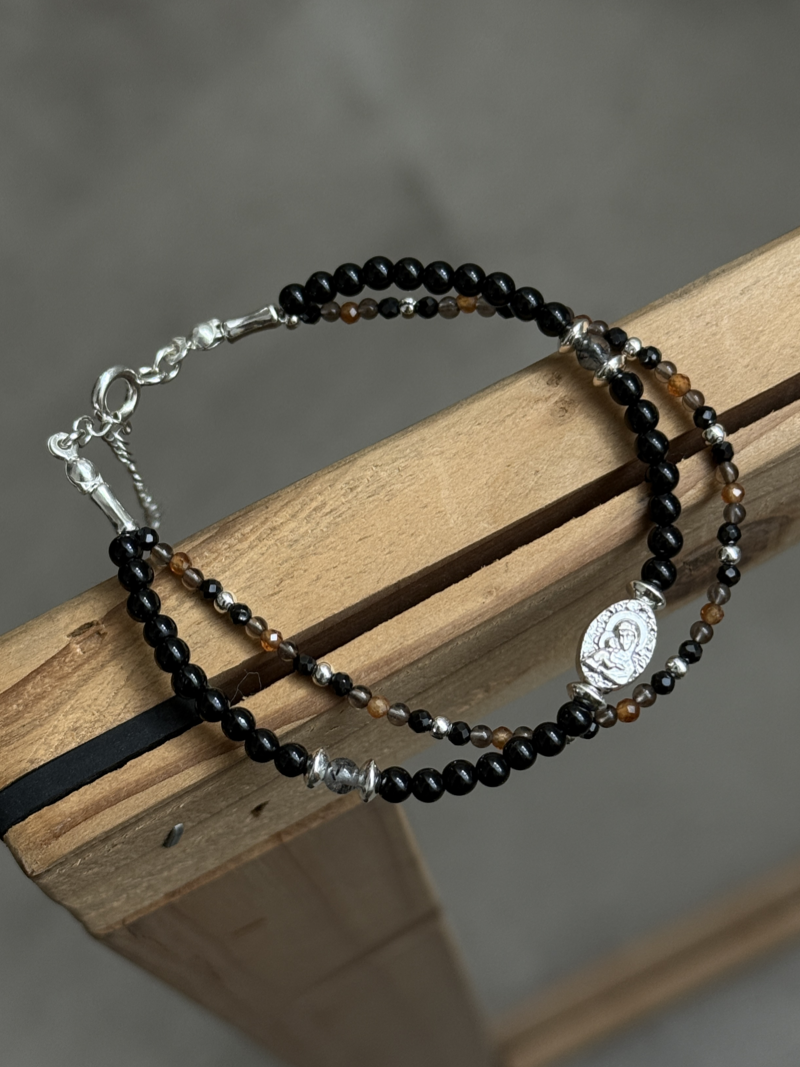 Silver925×天然石|オニキス スモーキークォーツ ヘソナイト マリア様 2連ブレスレット(Reeplushハンドメイド)