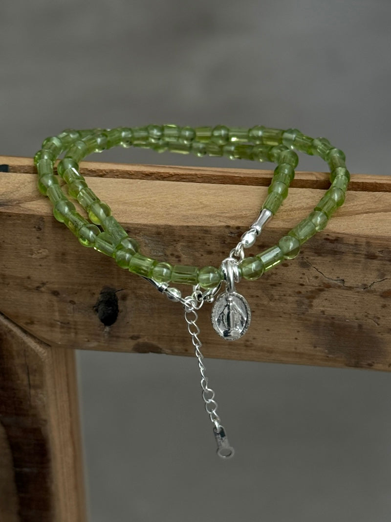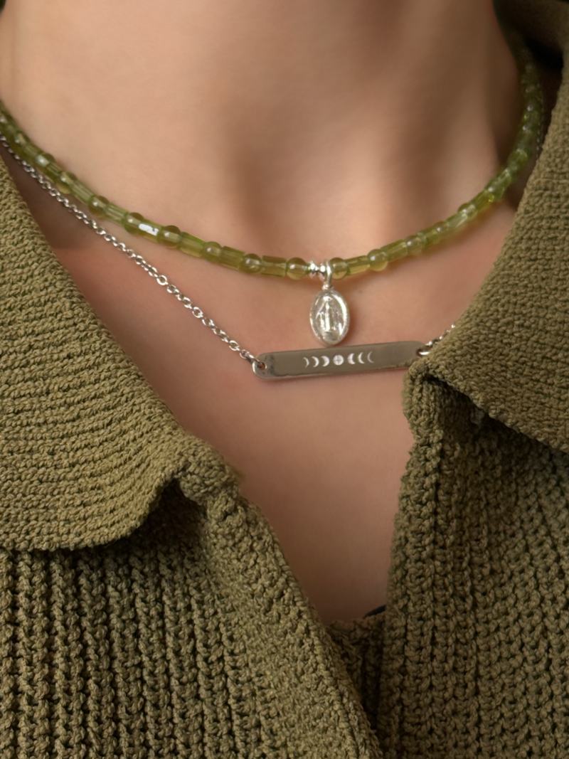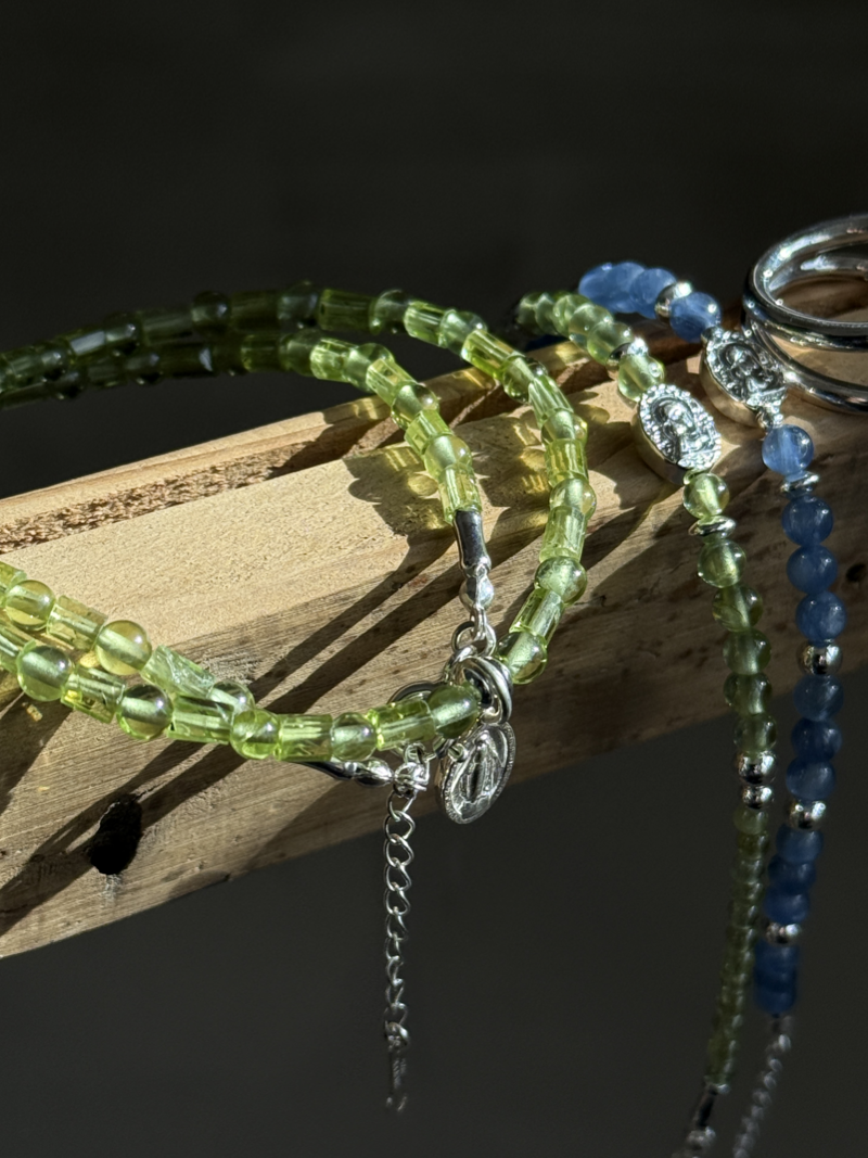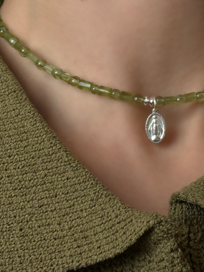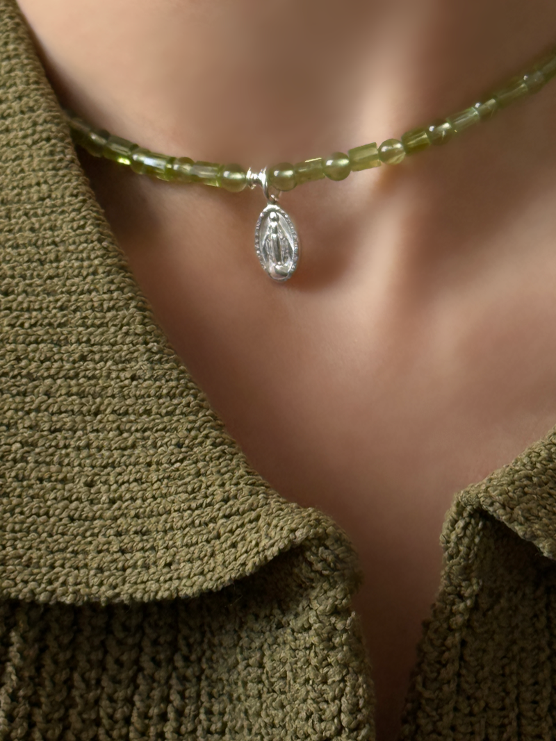 センターにはメダイチャームをあしらい、祈りや守護の象徴としてさりげない存在感をプラス。主張しすぎないサイズ感で、日常の装いにも自然に馴染みます。ペリドットの透明感ある輝きと相まって、軽やかで洗練された印象を演出します。