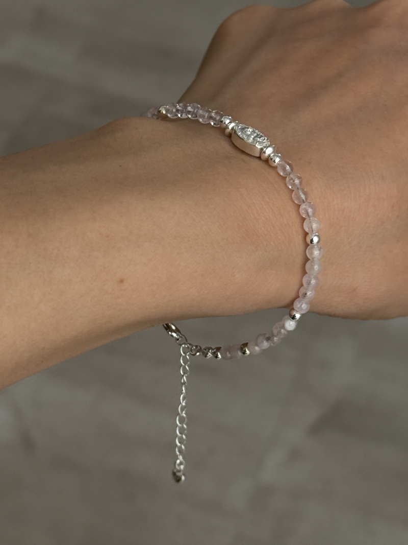 淡くやさしいピンクカラーが魅力のモルガナイトを、3mmのラウンドビーズで丁寧に連ねたブレスレットです。