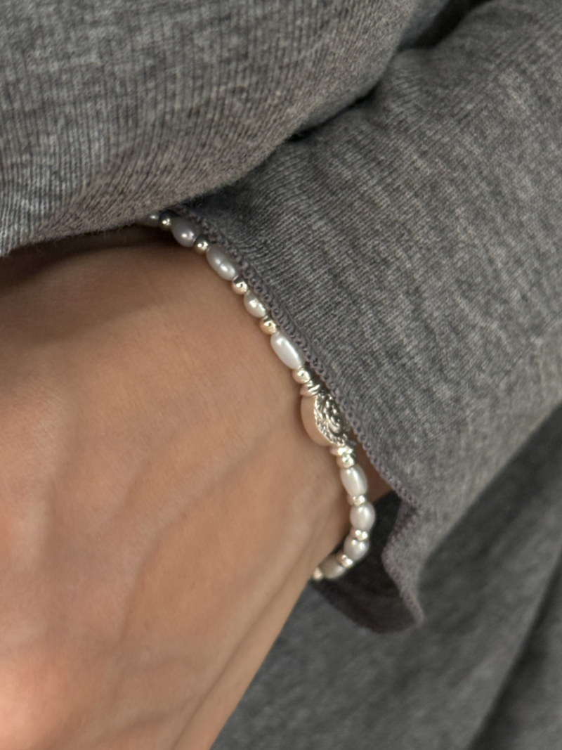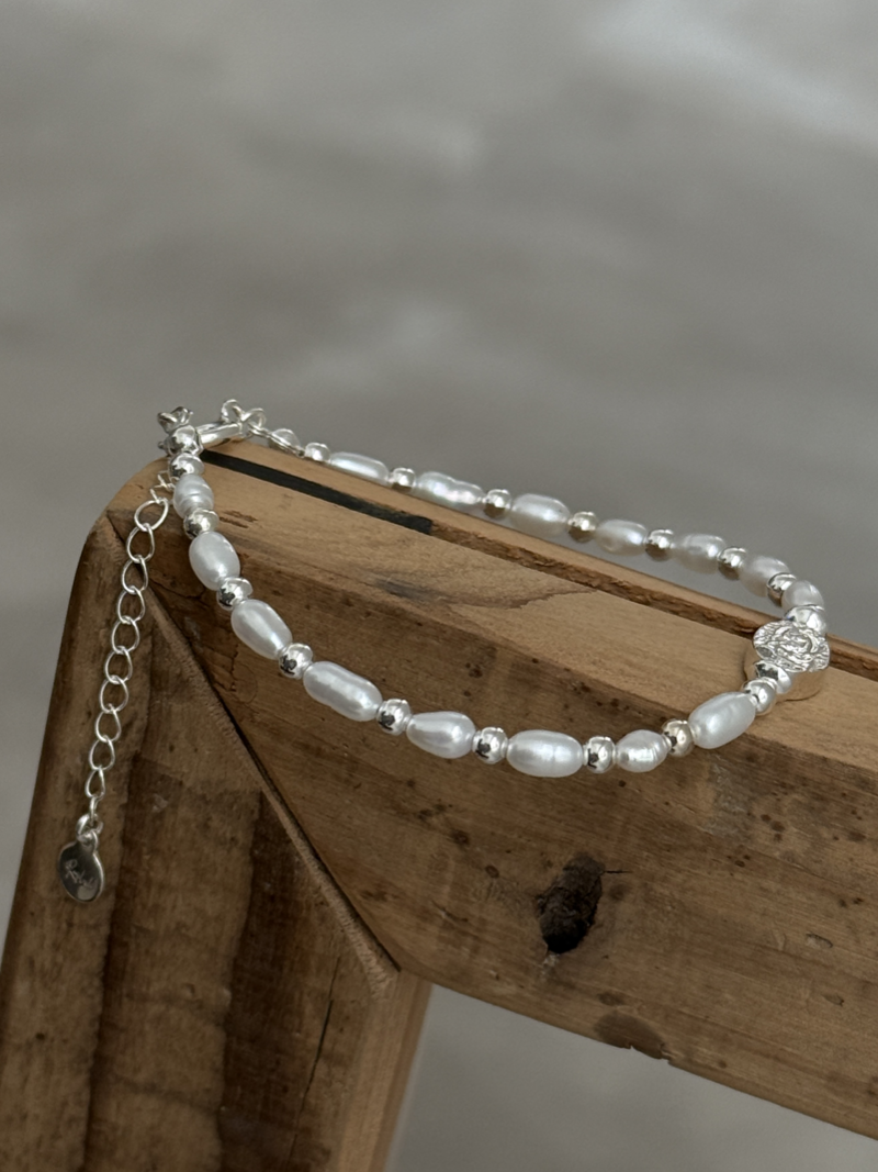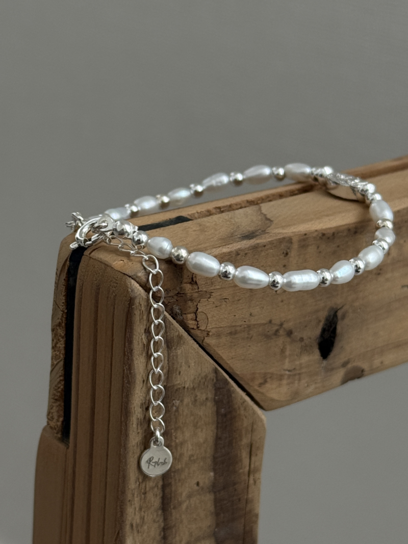 俵のようなふっくらとしたフォルムが魅力のバロックパールと、輝きを添えるシルバービーズを交互に連ねたブレスレットです。