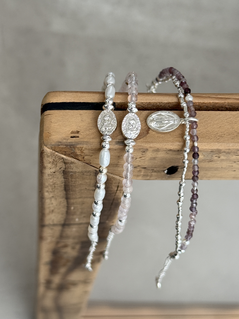 中央には小さなメダイを配置し、上品な中にもお守りのような温かみを感じるデザインに仕上げました。