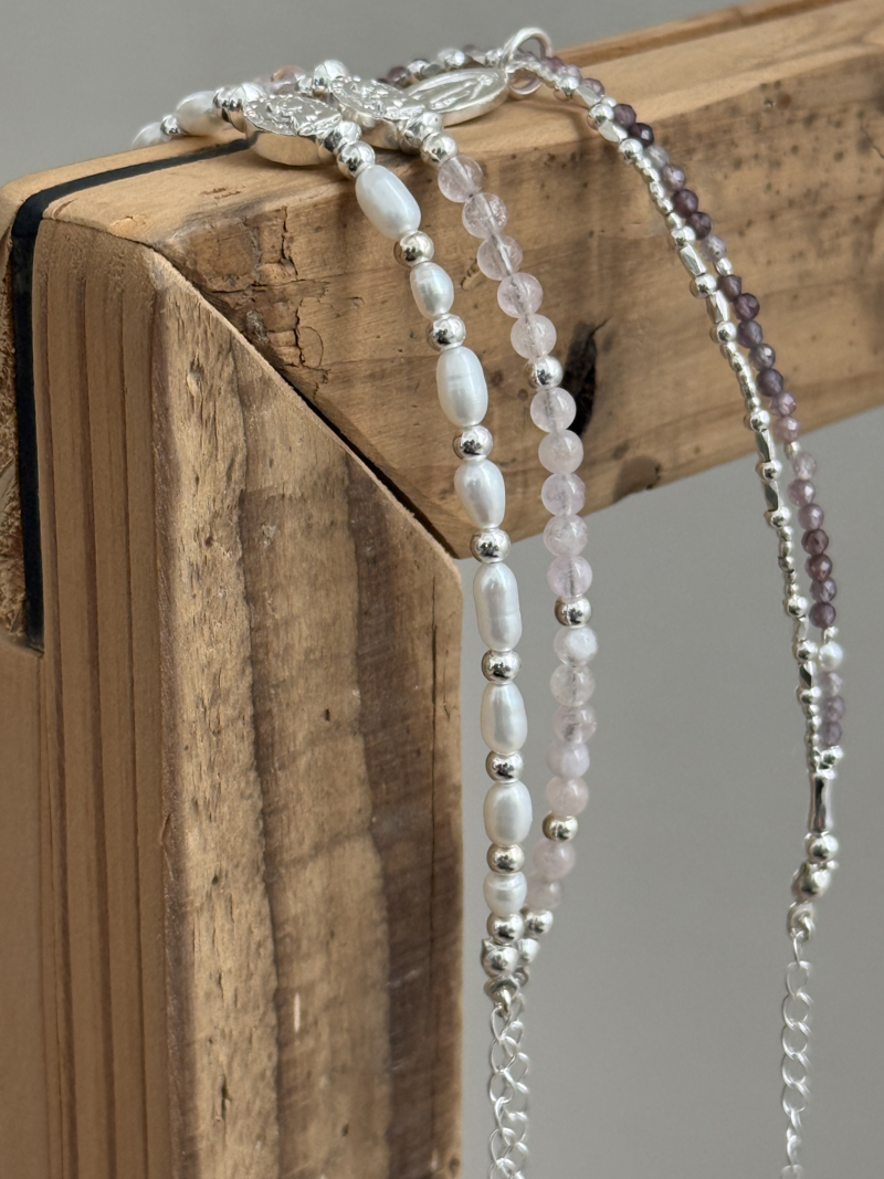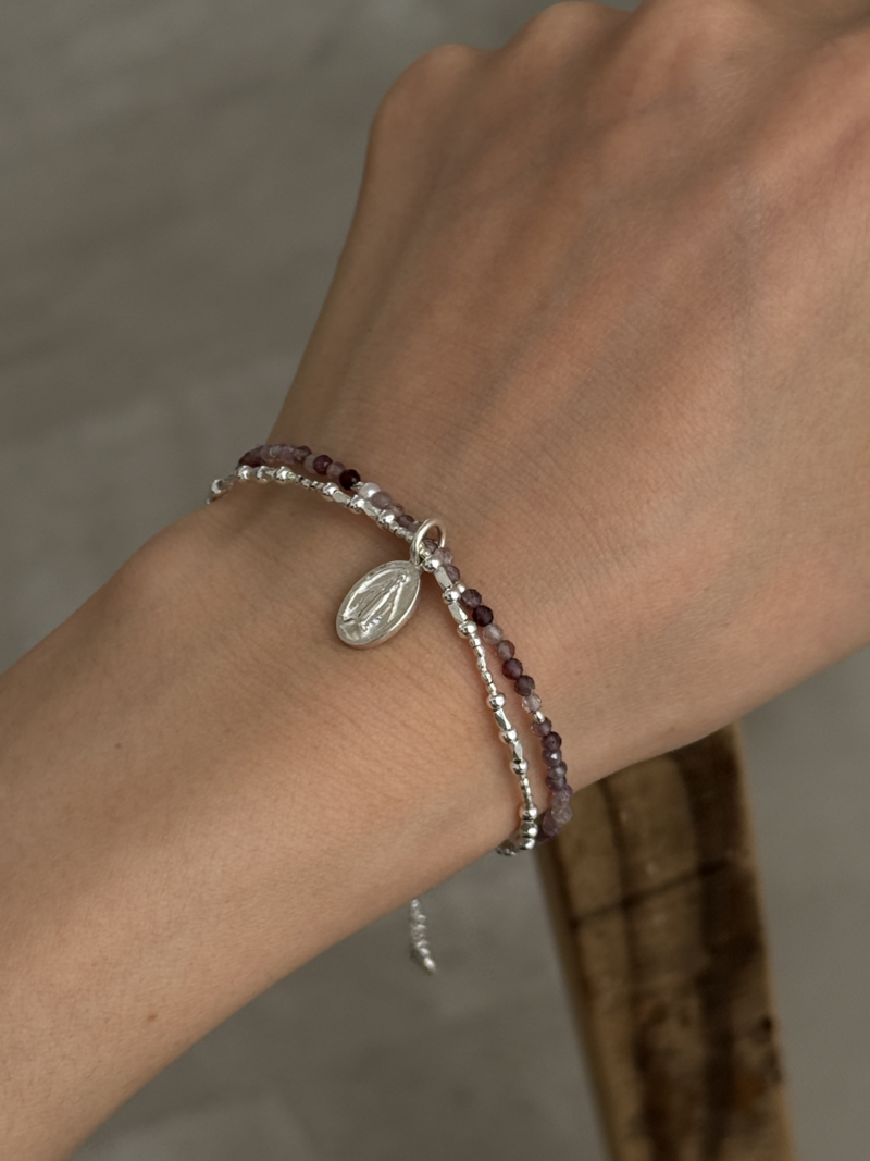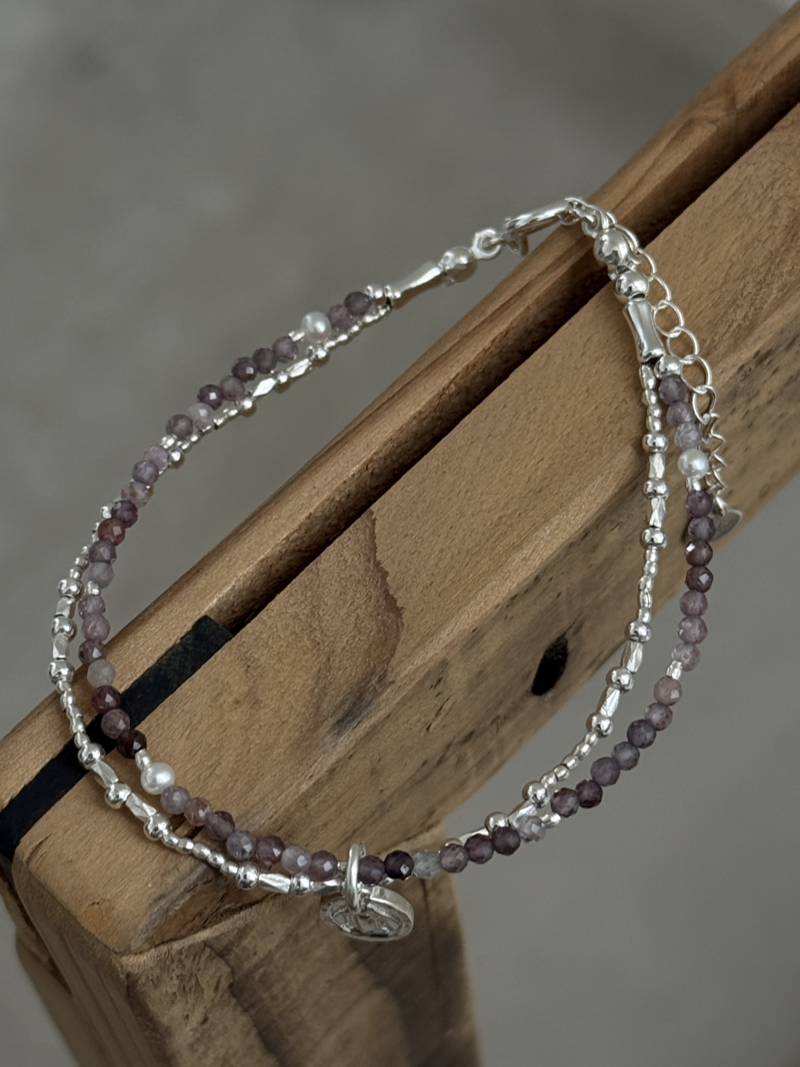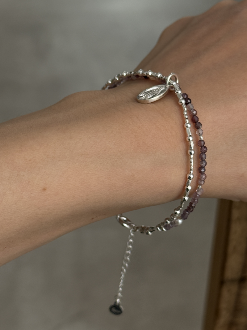 繊細にカットされた2mmのパープルスピネルと、光を反射してさりげなく輝くシルバービーズを組み合わせた2連ブレスレットです。
