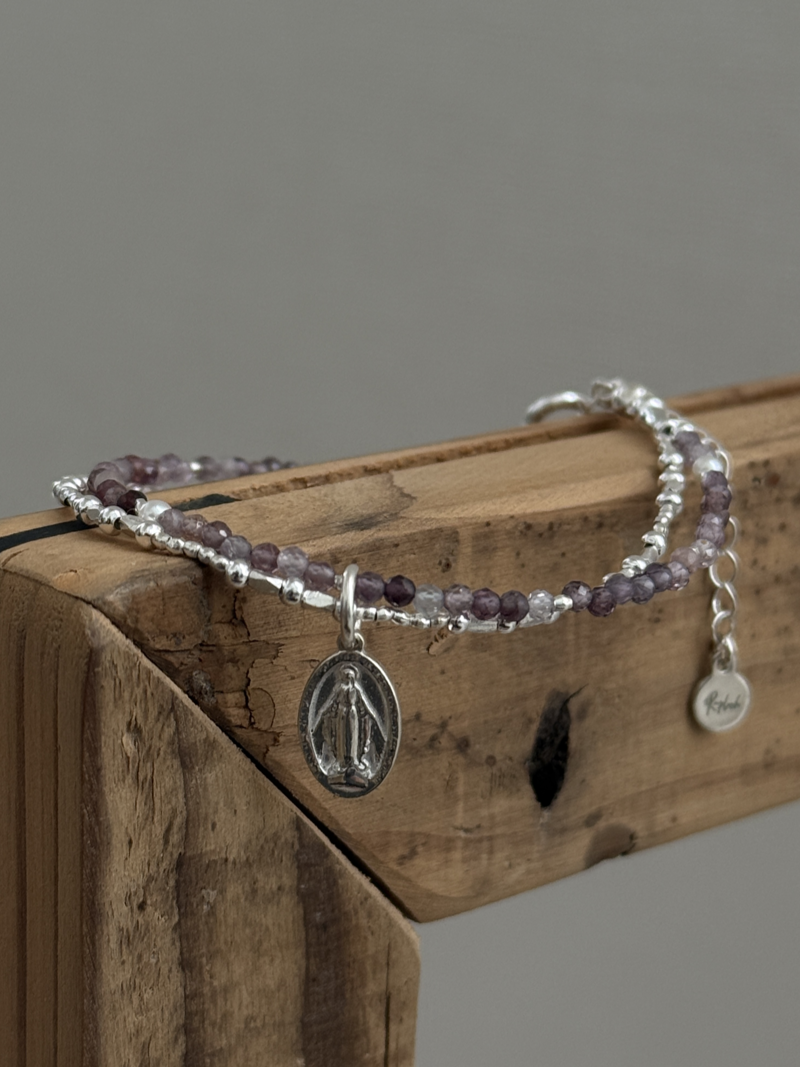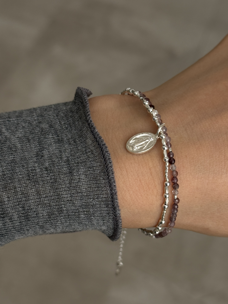2本を束ねるように配置されたメダイチャームが、ブレスレット全体をやさしくまとめ、お守りのようにそっと寄り添います。
