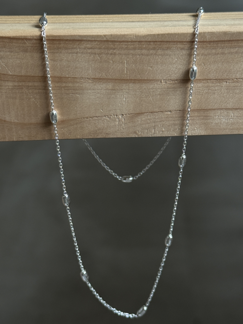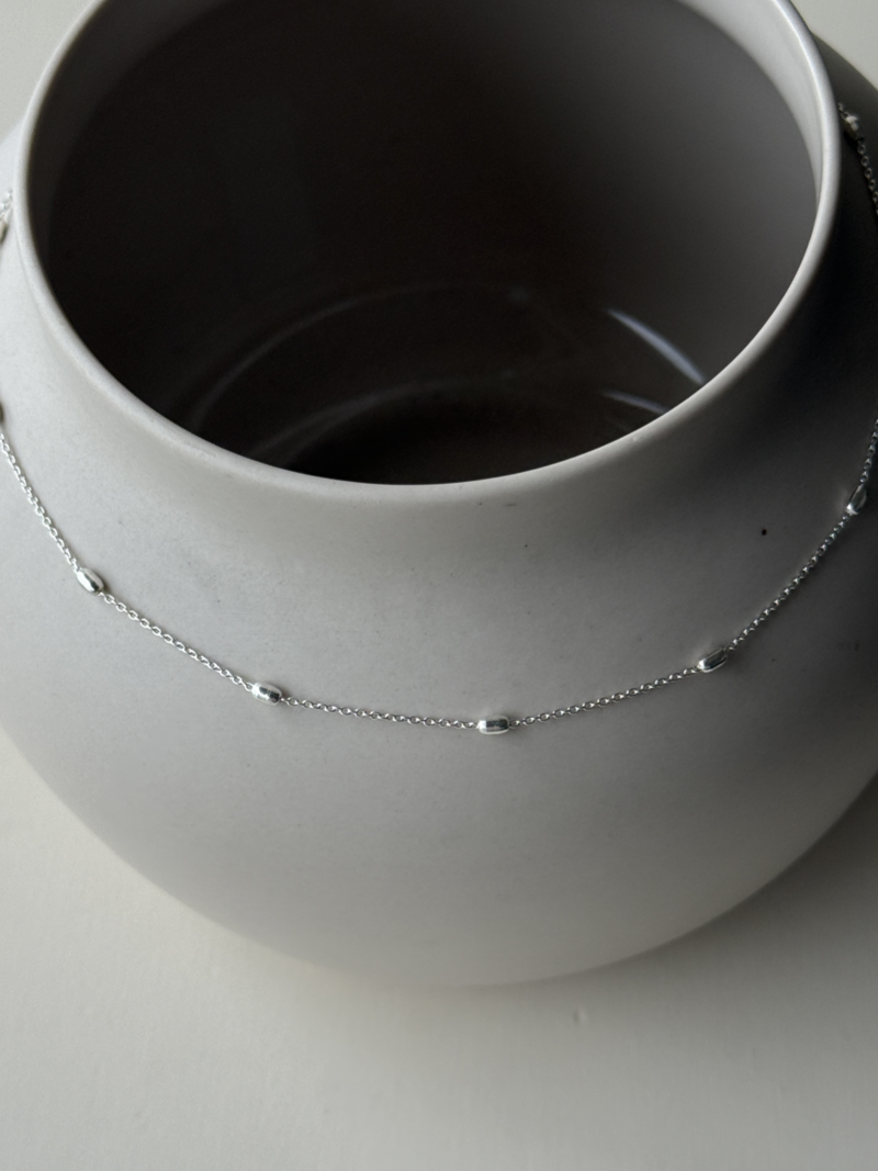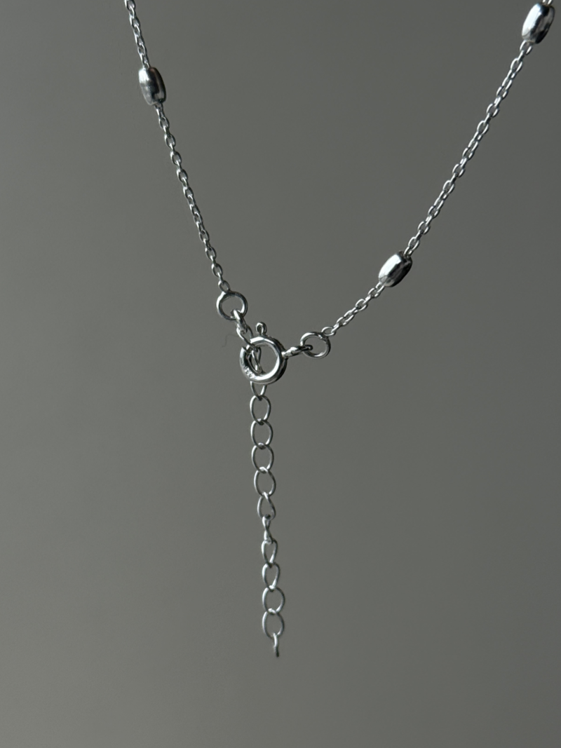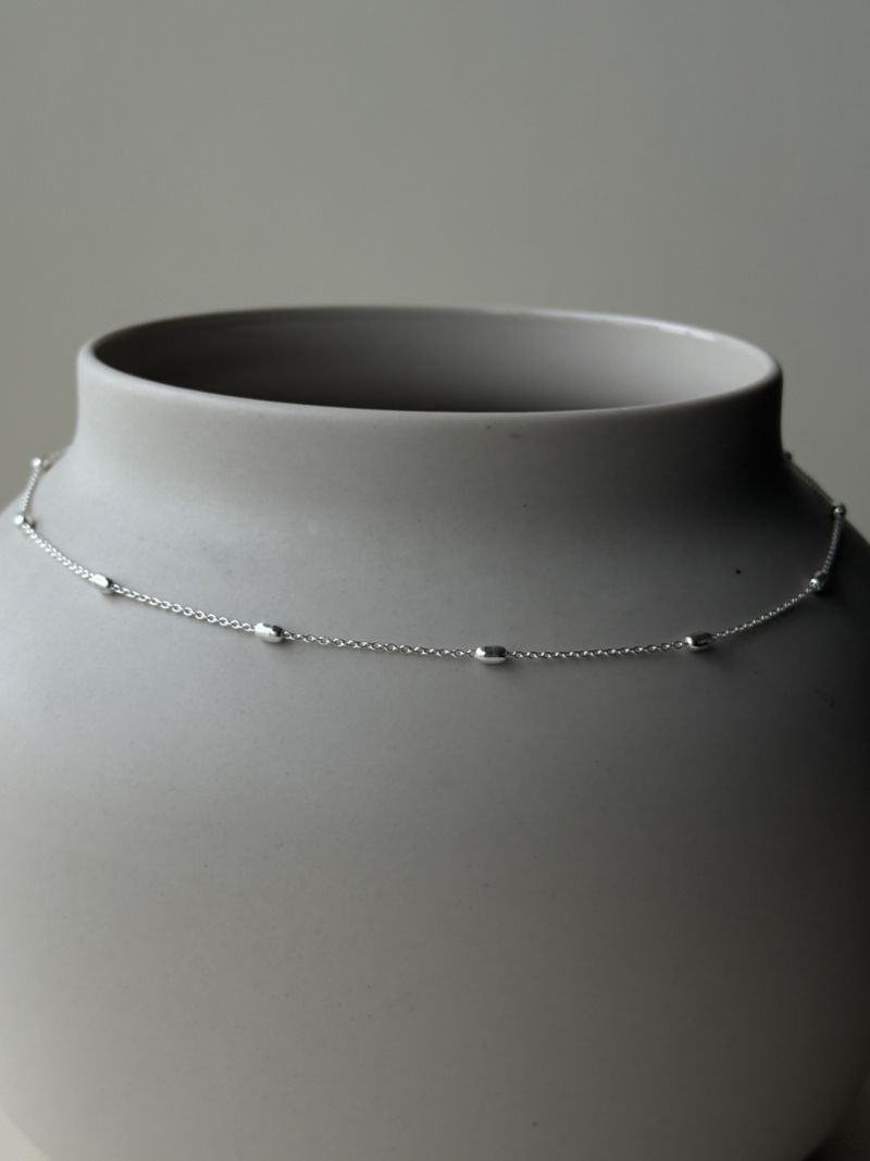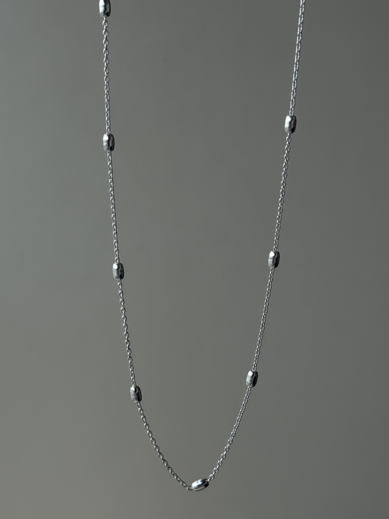 幅約1mmの華奢なチェーンに、等間隔に施されたオーバールビーズが、さりげなくも印象に残るシルバーチェーン。