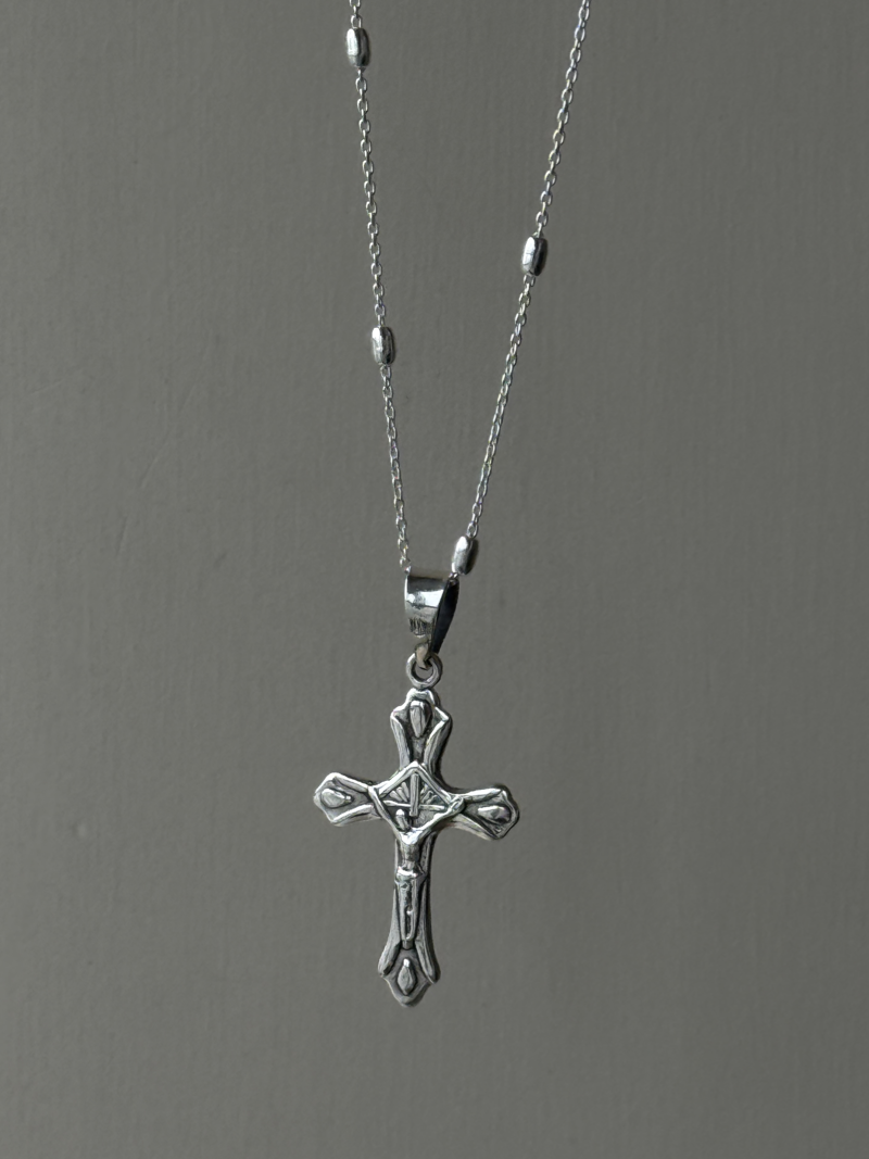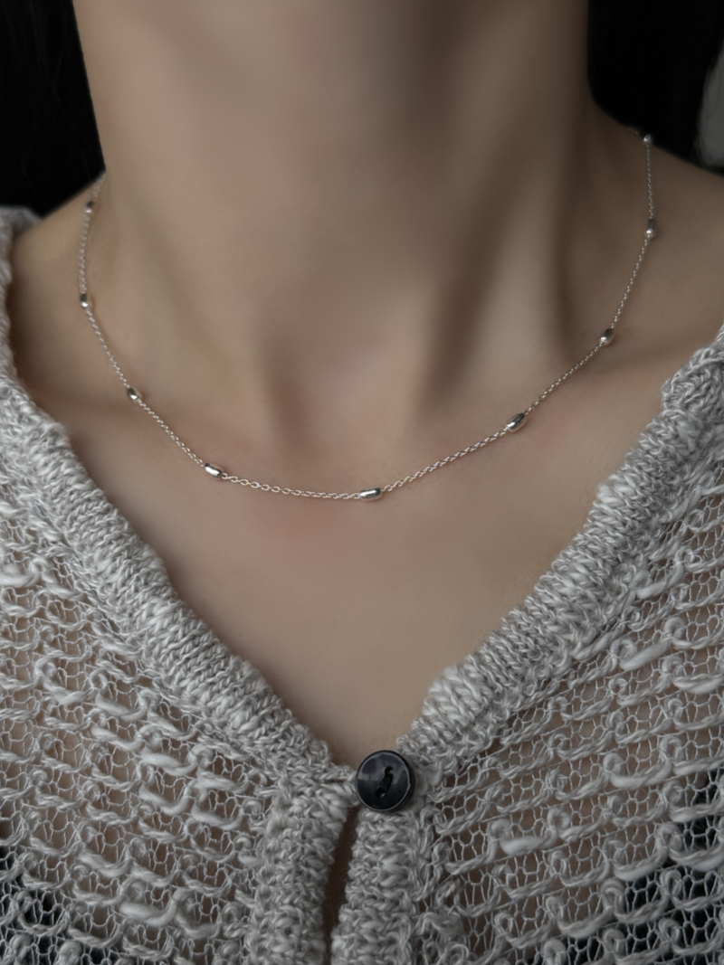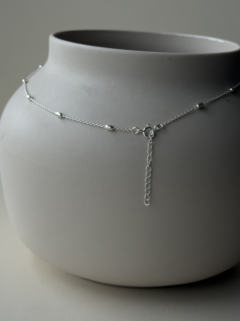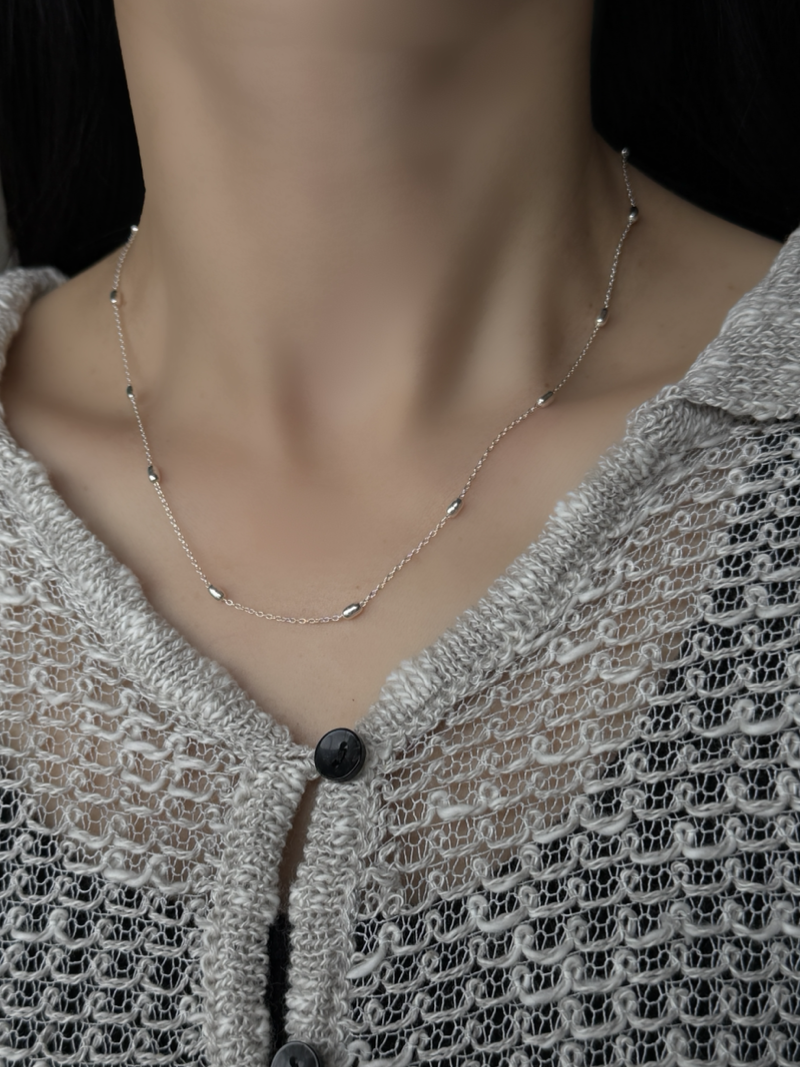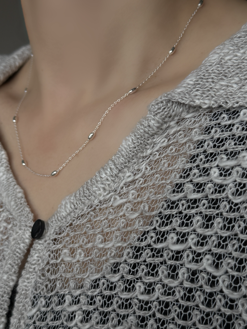 幅約1mmの華奢なチェーンに、等間隔に施されたオーバールビーズが、さりげなくも印象に残るシルバーチェーン。