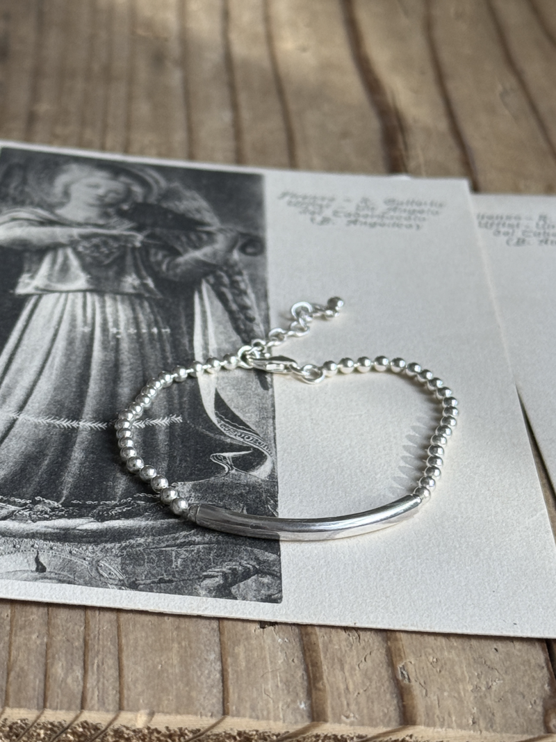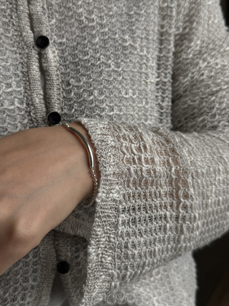 中央には滑らかなカーブのバーをあしらい、シンプルながらも程よいアクセントに。華奢すぎず存在感もあり、1本での着用はもちろん、他のブレスレットとの重ね付けにもおすすめです。