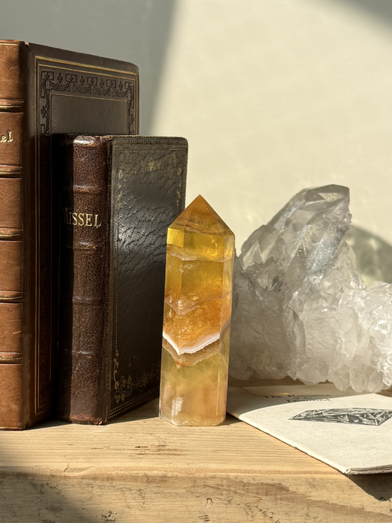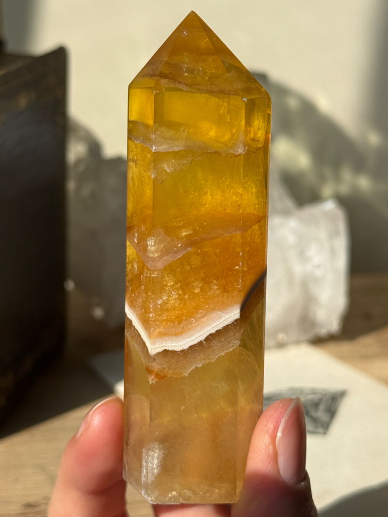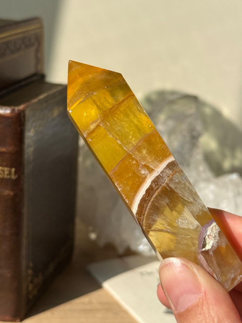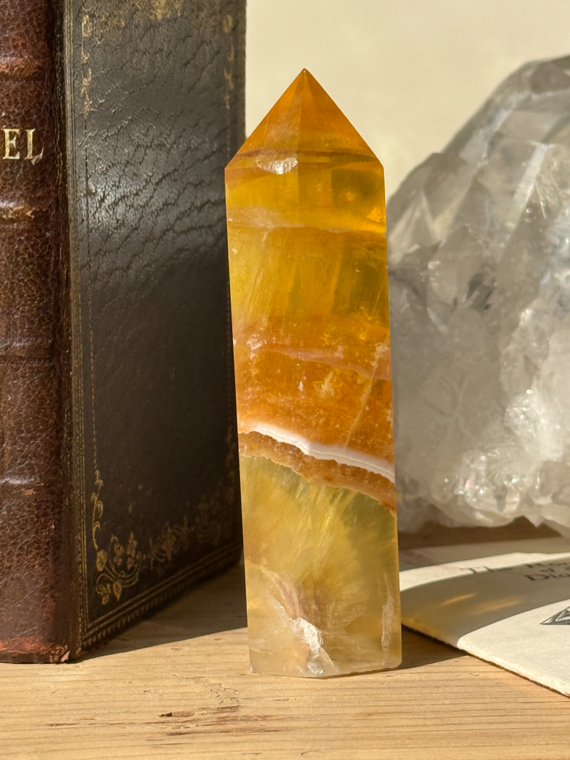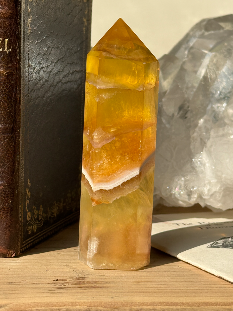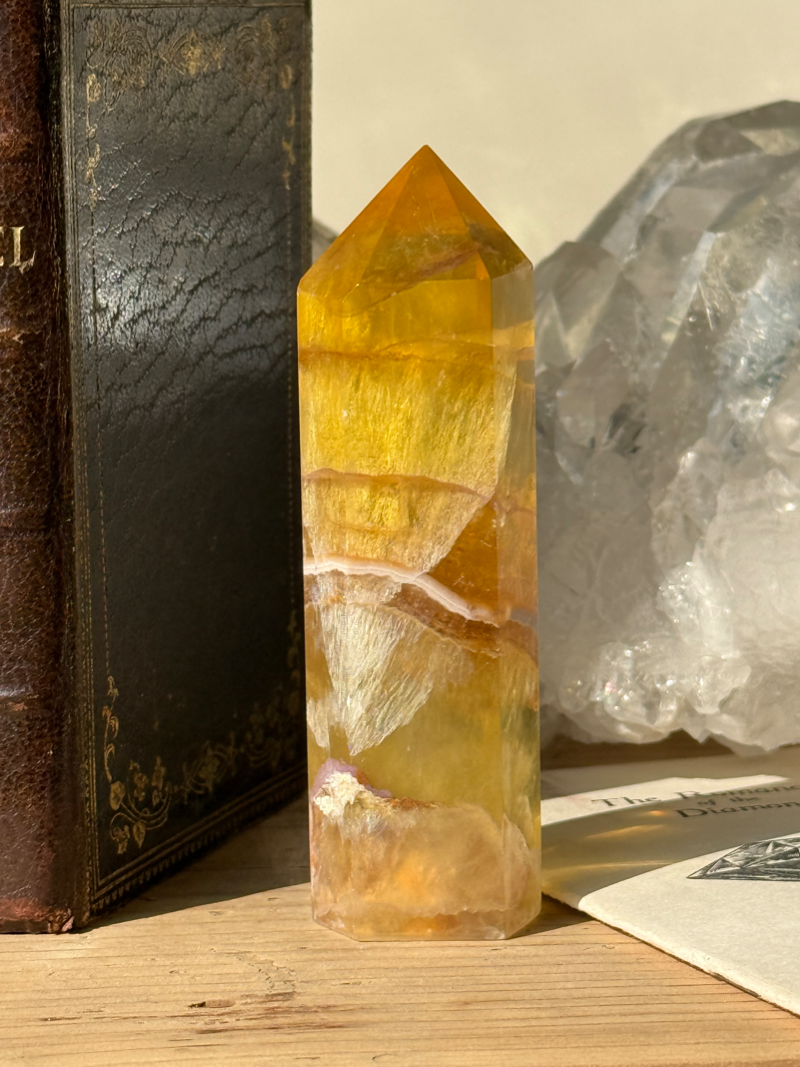 やわらかな黄色から蜂蜜色のような色合いを持つフローライトです。