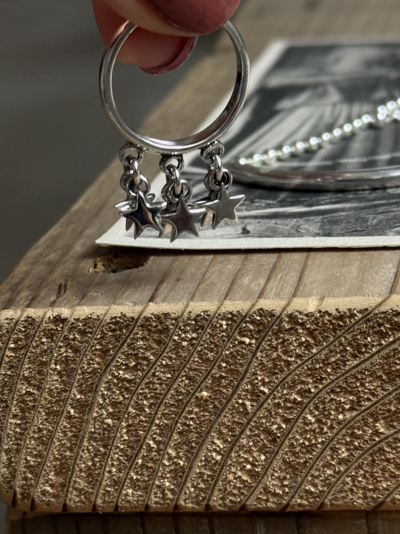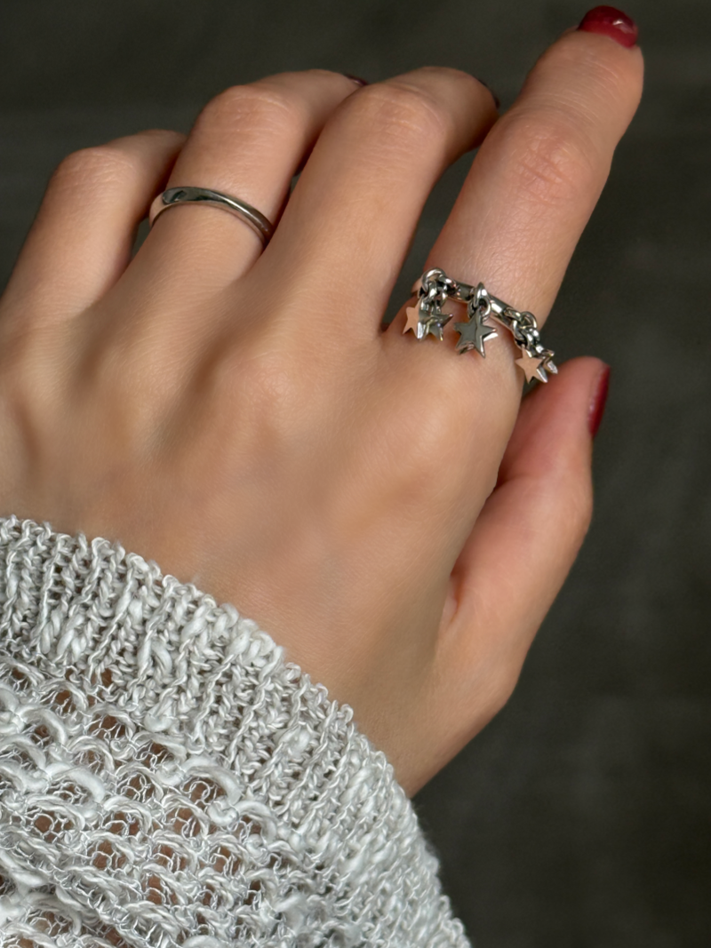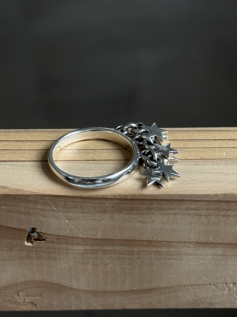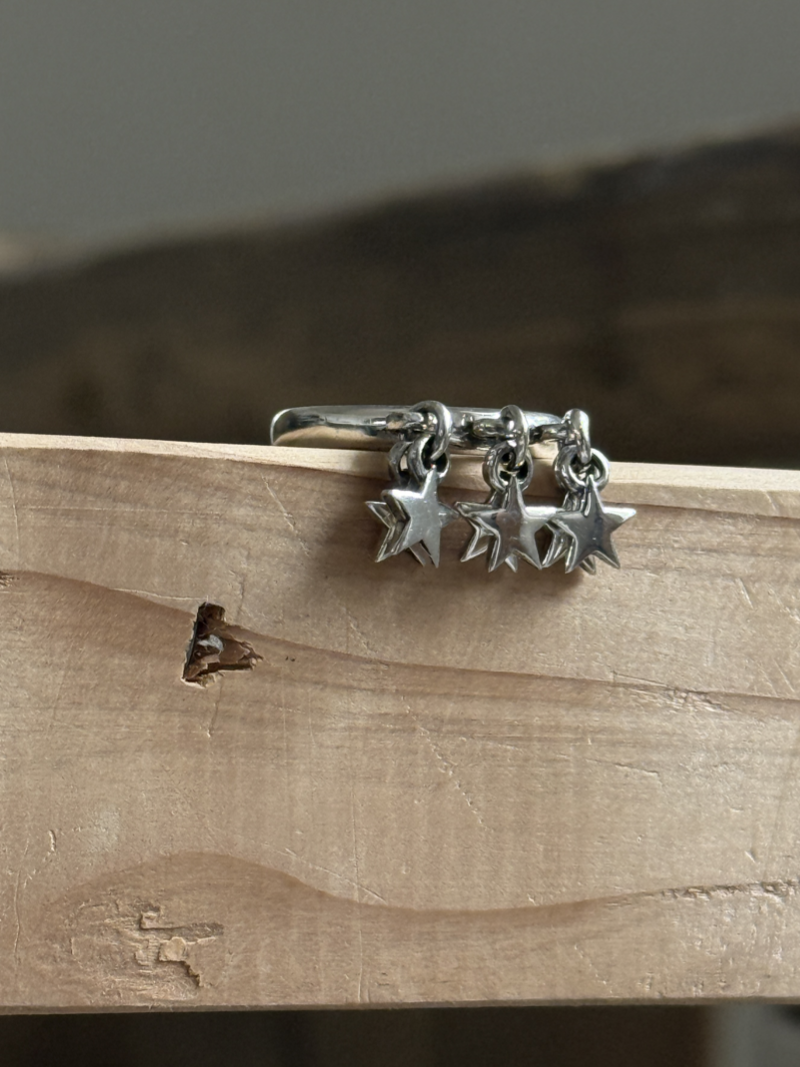 約2.8mm幅の華奢なアームに、フロント部分には6mmサイズの星型チャームを配置。3列にそれぞれ2個ずつ、合計6個のチャームが揺れることで、動きに合わせてさりげなく輝きを放ちます。